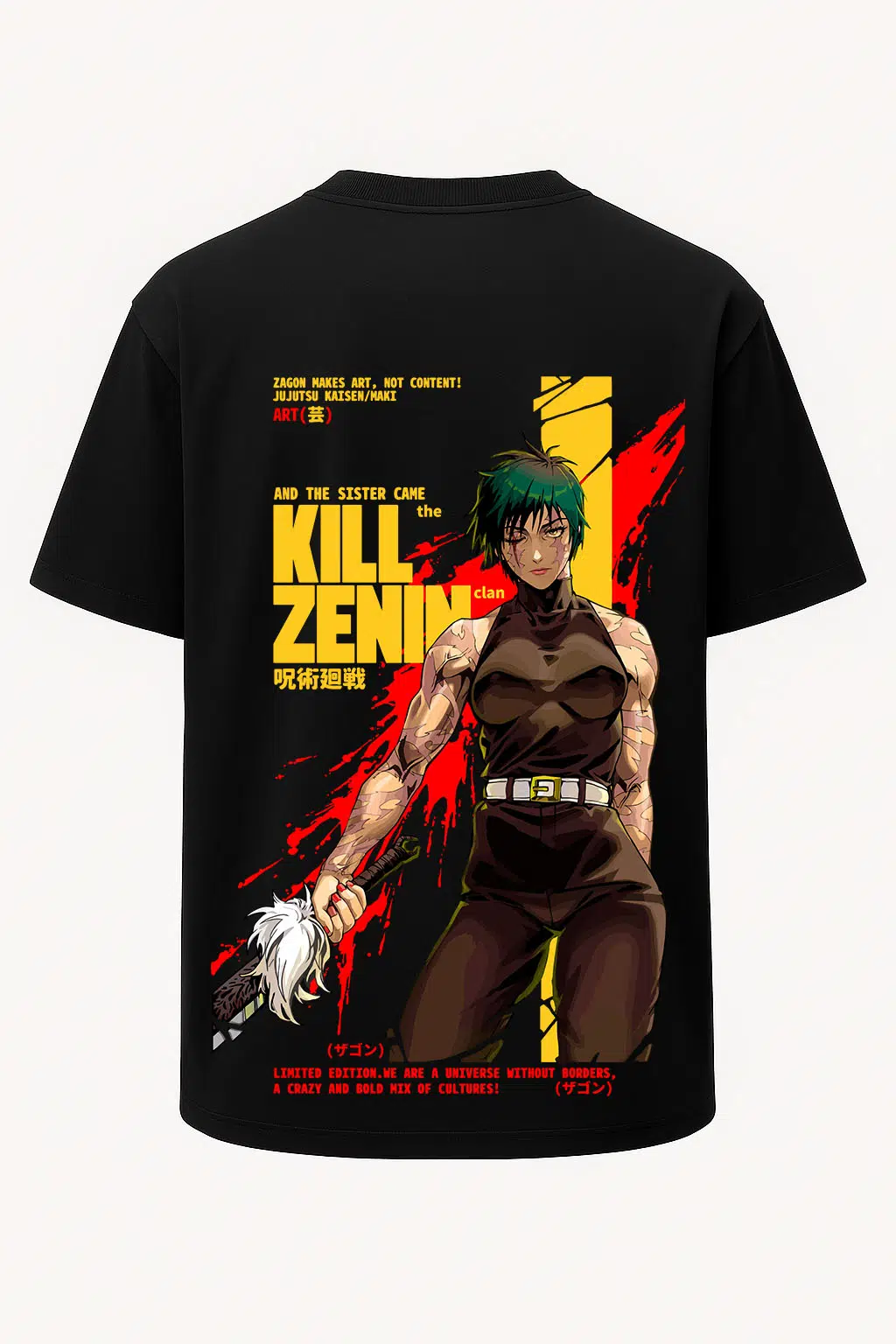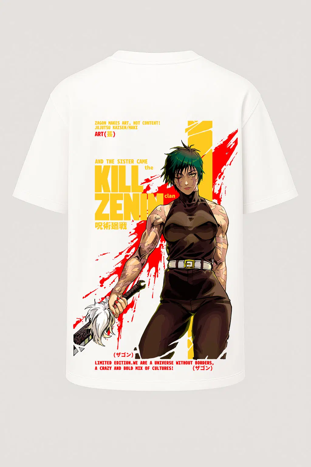 Maki Zenin Jujutsu Kaisen Geniş Baskılı Oversize Tişört 55 cm uzunluğa sahip geniş bir tasarım alanına sahiptir. Tam boy Jujutsu Kaisen baskı sevenler için özel olarak üretilen oversize tişört unisex tasarımda ve %100 organik pamuk kumaştan üretilmiştir. Geniş kesim yapısıyla, bol giyim tercih edenlere özel yapıdadır. Nefes alabilir kumaşı sayesinde sıcak günlerde bile konforlu bir deneyim yaşatır. Yüksek dayanıklılığa sahip transfer baskı teknolojisi uygulanan baskılı tişörtlerimiz her yıkamada canlılığını korur. Hem kendiniz için şık bir seçim, hem de sevdiklerinize özel ve anlamlı bir hediye alternatifi olarak tercih edebilirsiniz.